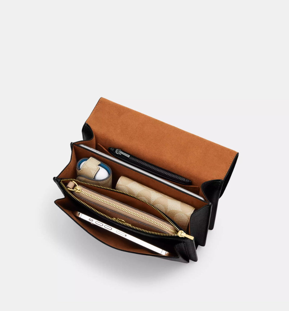 Outside slip pocket Inside zip and multifunction pockets Snap closure |